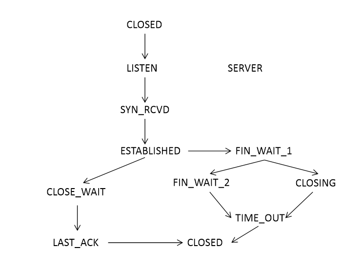 서버측과 클라이언트 측 관점으로 나눈 TCP 상태 전이도이다. TCP의 신뢰성 보장을 위한 기능중 하나이다. 소켓의 종료는 누가 먼저 종료 요청을 보내느냐의 따라 달라지며 먼저 자신이 닫았을 경우 ACK 패킷을 송신함을 끝으로 TIME_OUT 상태에서 대기하다 소켓이 종료된다. 이 종료 시간은 커널에서 설정이 가능하다.