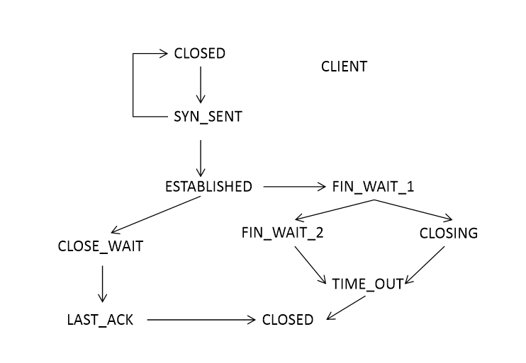 서버측과 클라이언트 측 관점으로 나눈 TCP 상태 전이도이다. TCP의 신뢰성 보장을 위한 기능중 하나이다. 소켓의 종료는 누가 먼저 종료 요청을 보내느냐의 따라 달라지며 먼저 자신이 닫았을 경우 ACK 패킷을 송신함을 끝으로 TIME_OUT 상태에서 대기하다 소켓이 종료된다. 이 종료 시간은 커널에서 설정이 가능하다.