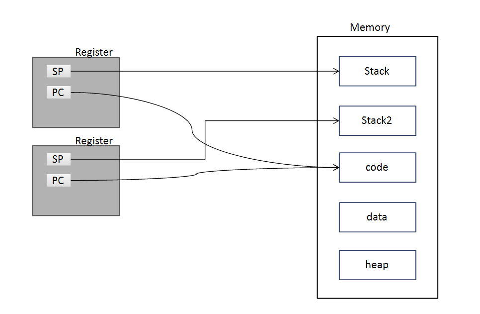 한 프로세스에 두 개의 스레드가 있는 경우이다. 스레드를 이해하는데 많은 도움을 줄 것이다. 각각의 스레드는 독립된 레지스터와 스택을 갖고 나머지 것들은 공유하게 된다.