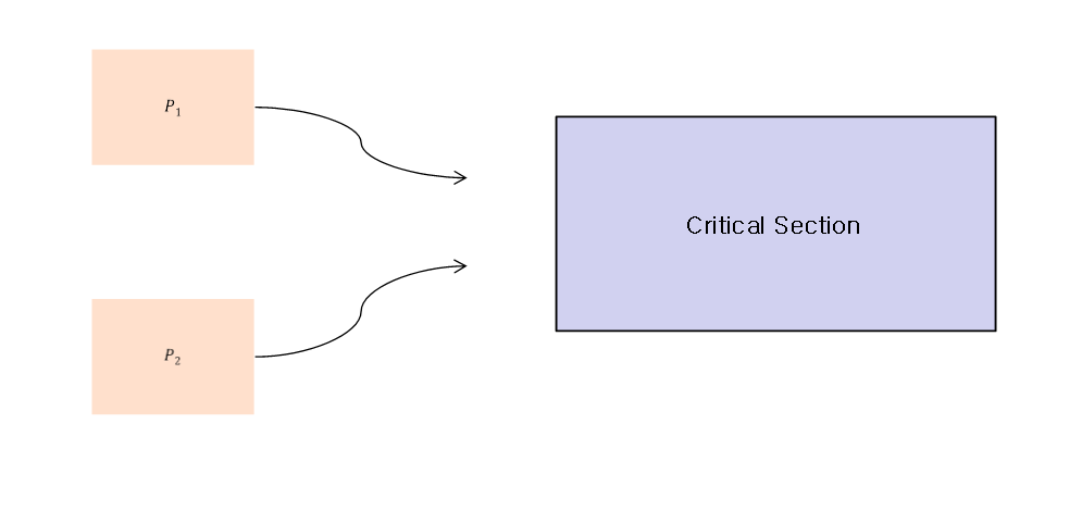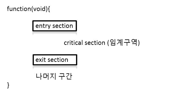프로세스 처리 루틴에는 임계 구역이라는 부분을 가지고 있습니다. 적어도 하나 이상의 프로세스와 공유 데이터를 접근 또는 갱신합니다. 임계 구역에서는 동시에 두 개 이상의 프로세스가 실행되지 못해야 합니다. 각 프로세스들이 진입 요청을 하고 임계 구역에 진입을 해야 합니다.