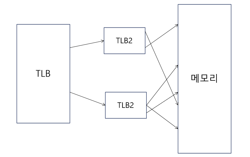 페이징을 할 때 페이지 테이블을 참조하여 페이징을 수행하게 됩니다. 메인 메모리에 저장하게 되면 메모리 액세스 시간이 느려 지연이 발생할 수 있습니다. 때문에 TLB라는 특수 하드웨어 캐시가 사용됩니다. 명령어 파이프라인에 일부로 동작하여 매우 빠르게 동작하며 이 때문에 TLB는 작은 크기를 유지하게 됩니다. 여러 단계를 나누어서 TLB 항목의 개수를 늘릴 수 있습니다.