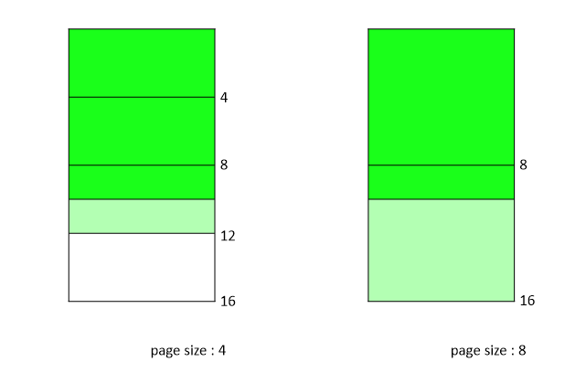 만약 한 번에 할당하는 페이지 크기가 매우 크다면 더더욱 남는 공간이 발생하게 됩니다. 그렇다고 페이지의 크기가 너무 작다면 페이지 테이블의 크기가 너무 커지게 됩니다. 때문에 적당한 페이지 크기를 지정해야 합니다. 위 사진과 같이 프로세스가 10의 크기를 할당받으려고 할 때 페이지 크기가 4인 경우 2만큼의 내부 단편화가 발생하지만 페이지 크기가 8인 경우 6 만큼 내부 단편화가 발생하게 됩니다.