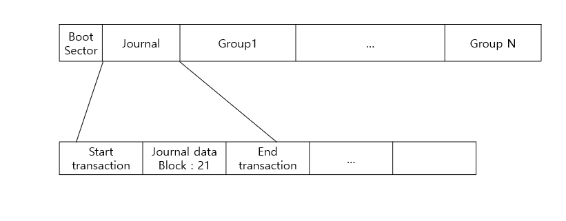 저널은 부트섹터 다음으로 이어지며 inode 테이블 번호가 저장된 파일로 구성되어 있습니다. 한 저널 파일당 트랜잭션 시작과 트랜잭션의 끝을 알리는 코드 단위로 커밋됩니다. 커밋이 완료되고 파일 시스템에 적용이 되었는지 여부를 체크포인트를 사용하고 검사가 완료된 저널 데이터는 이후 지워집니다.