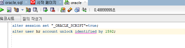 먼저 alter session set "_oracle_script"=true; 명령어를 입력합니다. 이는 hr 계정 생성 시 '올바르지 않은 이름' 오류를 방지하기 위함입니다.