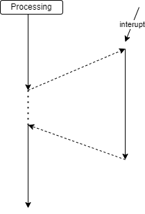인터럽트는 주요 예외처리나 우선순위가 높은 처리해야 할 때 진행 중이던 프로세스를 잠시 중단하고 인터럽트를 발생시키는 방식으로 진행됩니다. 주요 예외 상황이 이미 정해져 있으며 인터럽트가 발생하게 되면 인터럽트 서비스 루틴을 진행하게 됩니다. 이미 인터럽트를 처리하기 위한 루틴이 프로그램되어있고 인터럽트가 발생하면 그 루틴을 실행합니다. 완료되면 그 후 인터럽트 되어 멈췄던 연산을 재개합니다. 만약 예외 상황을 찾을 수 없거나 인터럽트를 제대로 처리하지 못할 경우 심각하면 가끔 보는 블루 스크린으로 이어지게 됩니다.