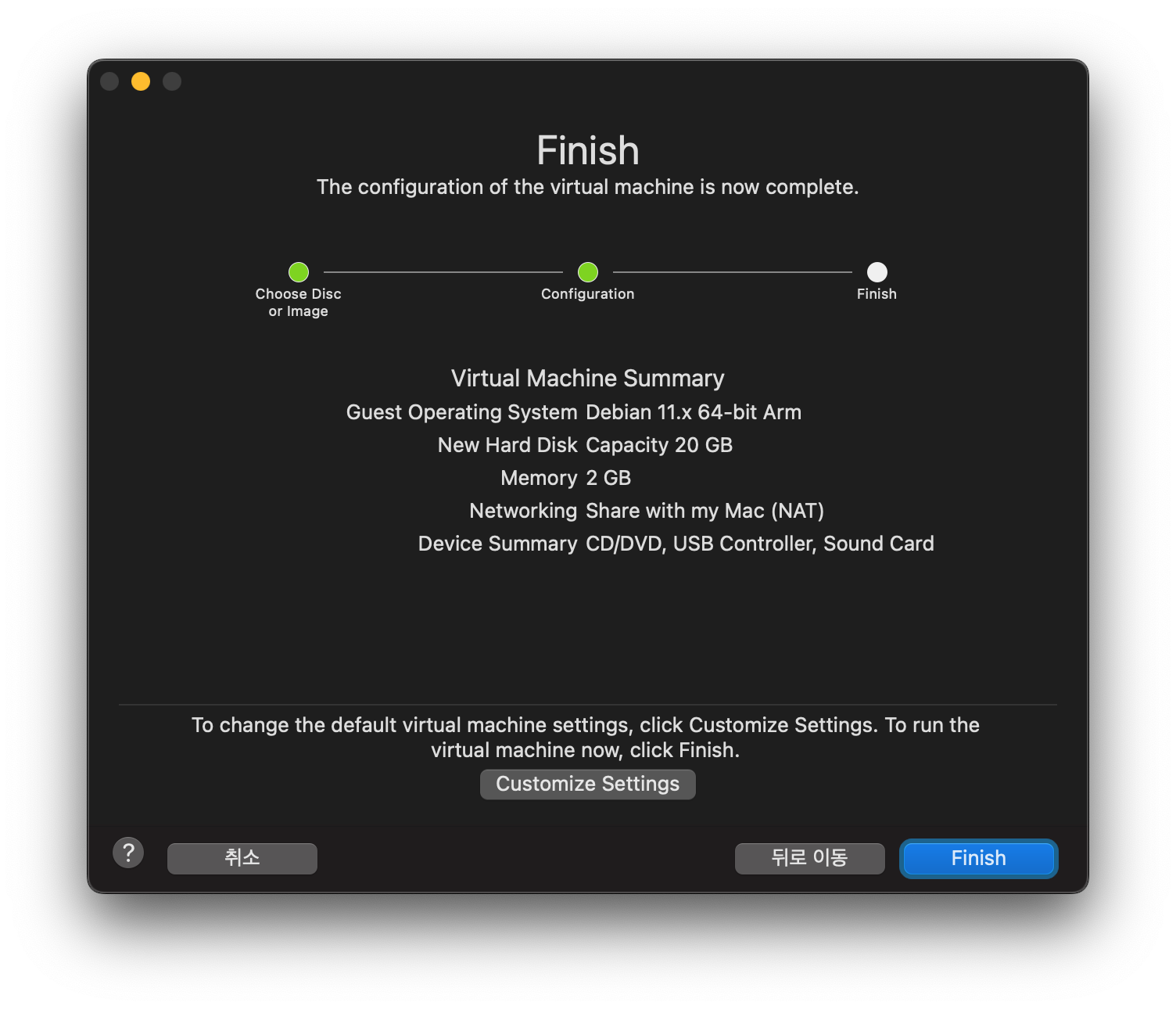 3. 다음과 같은 화면에서 설정을 완료해줍니다. 기타 메모리와 cpu설정은 vm이 중지된 상태에서 설정 가능합니다.