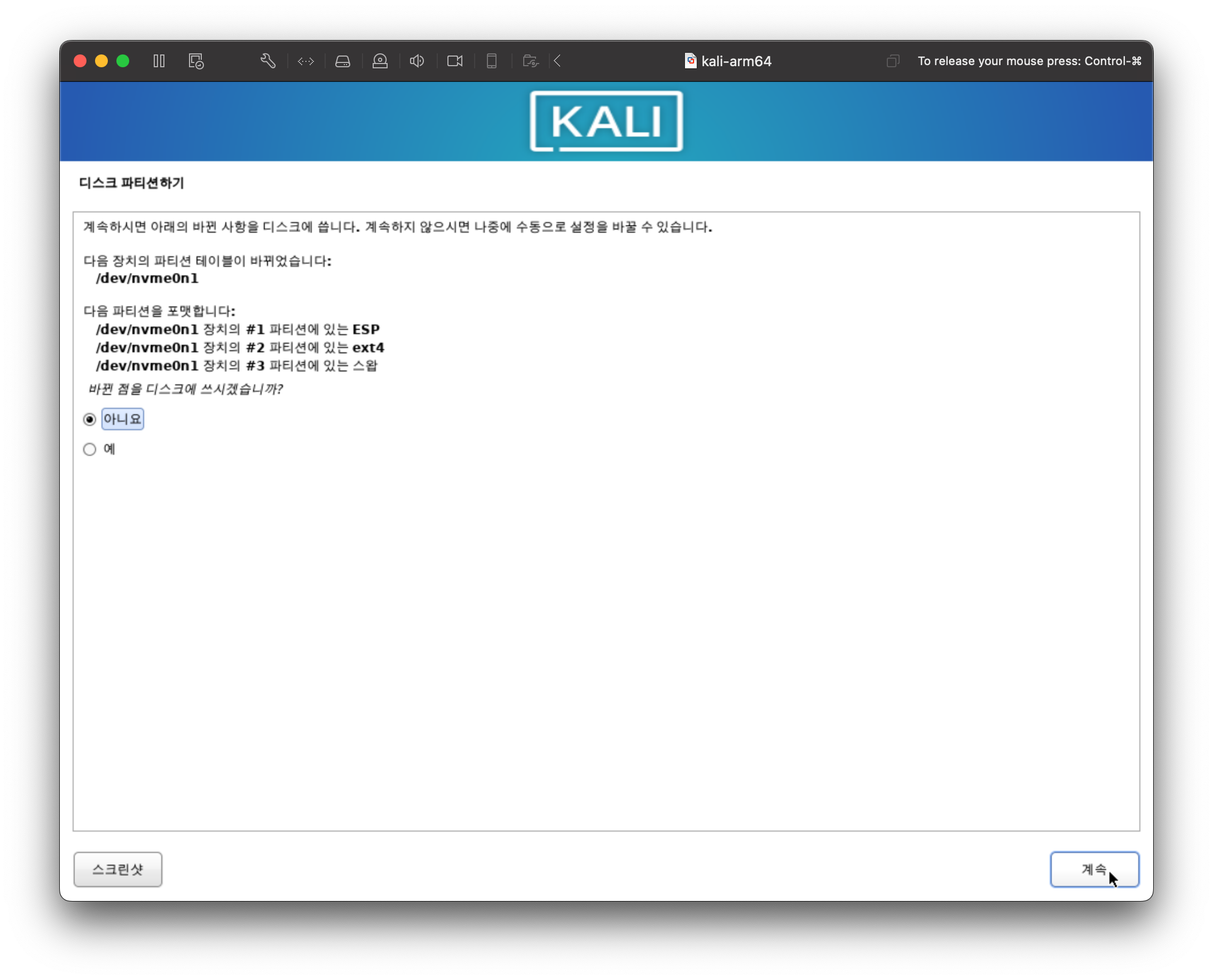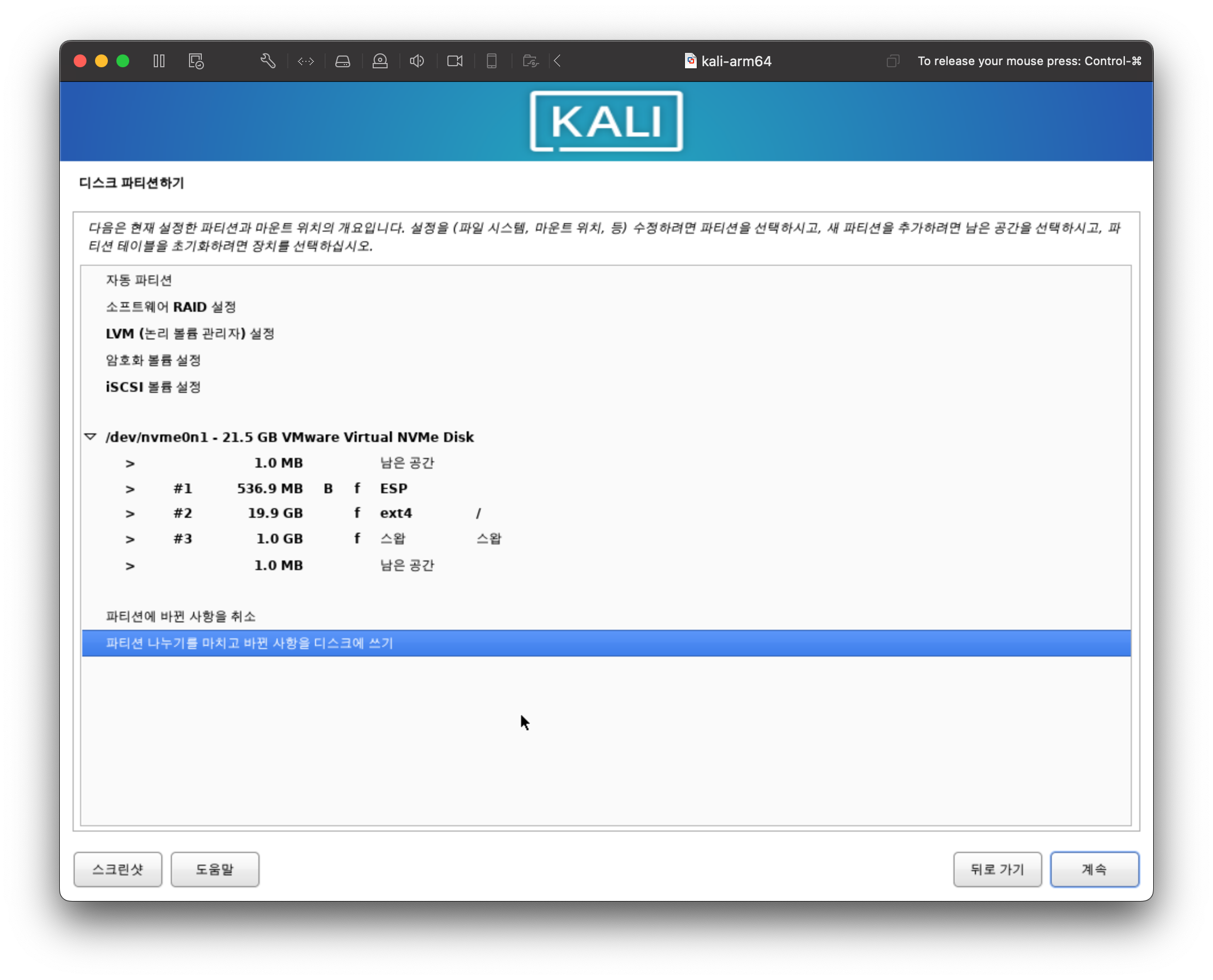 14 파티션 할당 항목을 보여줍니다. 자동 시 인스톨러가 자동으로 할당 설정을 합니다. 아래에 있는 '파티션 나누기를 마치고 바뀐 사항을 디스크에 쓰기'를 선택합니다.