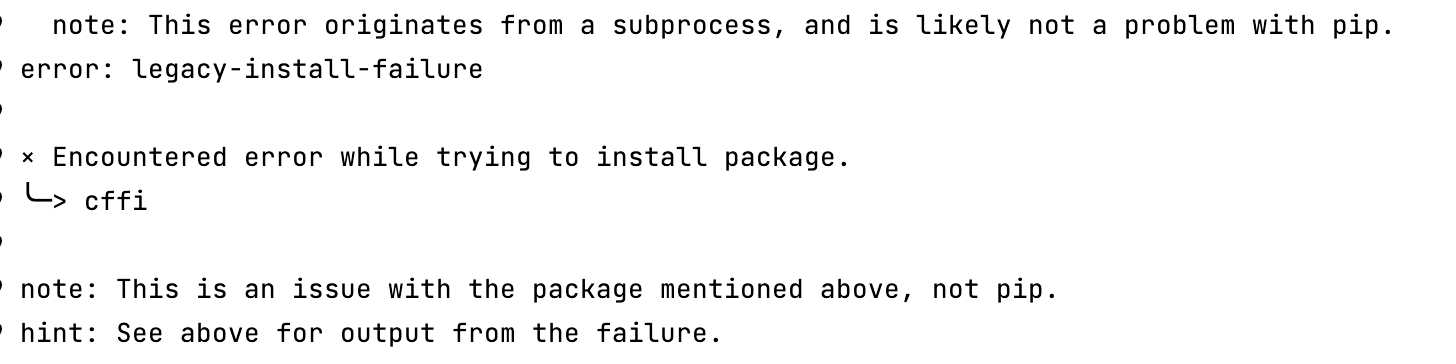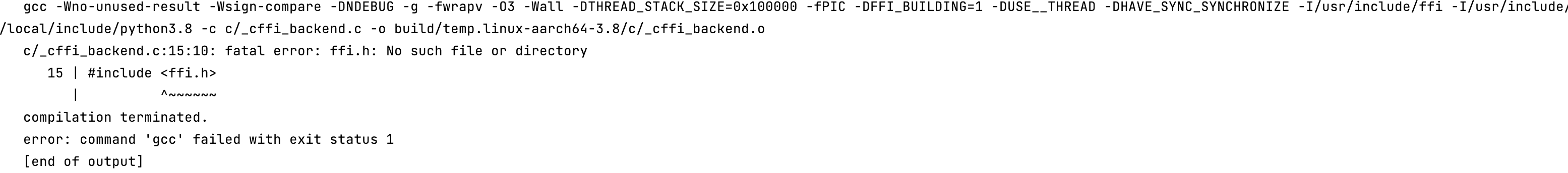 해당 문제는 ffi 관련 라이브러리가 부재해 cffi 패키지가 실패하는 문제가 발생합니다.