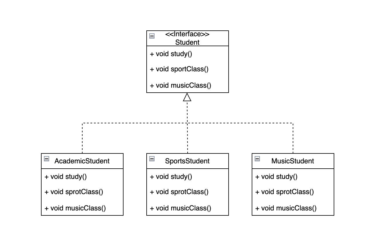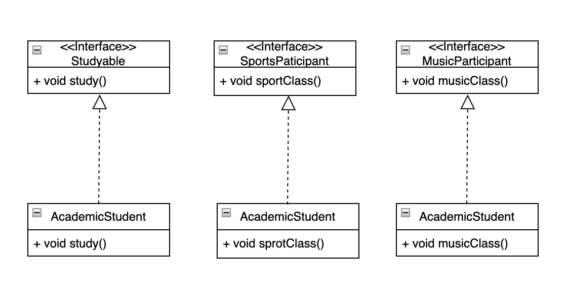 위와 같은 경우 다른 Student들이 사용하지 않는 클래스들을 포함하고 있다. AcademicStudent는 sportClass, musicClass를 이용하지 않음에도 구현되어야 한다.